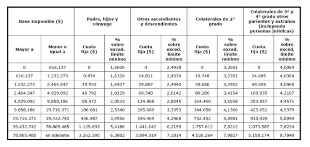 En cuanto a la alícuota aplicable y la forma de cálculo, el impuesto busca ser progresivo, estableciendo una tabla que se actualiza anualmente a través de la Ley Impositiva Anual que dicta la provincia, mediante la cual se modifican los “mínimos no imponibles” (actualmente en $1.344.000 para padres, hijos y cónyuge, en forma individual y en $322.800 para los restantes sujetos); la conformación de las diferentes escalas y alícuotas aplicables; etc., distinguiendo, a su vez, si los beneficiarios del enriquecimiento a título gratuito son (i) Padres, hijos ó cónyuges; (ii) Otros ascendientes y descendientes; (iii) Colaterales de 2° grado; o bien (iv) Colaterales de 3° y 4° grado, otros parientes y extraños (incluyendo personas jurídicas).