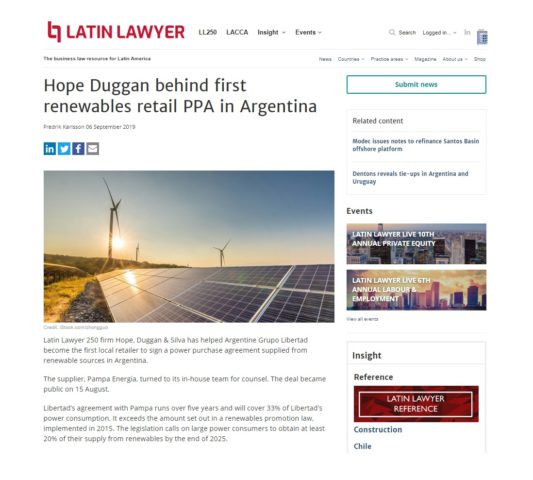 La publicación de asuntos legales menciona la intervención del estudio en relación con el asesoramiento a Grupo Libertad en su reciente acuerdo de suministro de energía renovable con Pampa Energía.